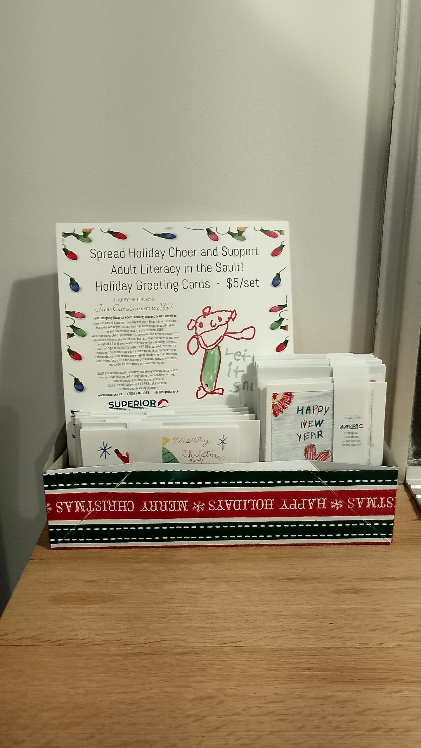 Help local not-for-proft adult literacy and skills upgrading center, Superior Adult Learning to spread some holiday joy this winter with the purchase of a set of these holiday greeting cards. Each card has been designed by an adult learner, and all profits go directly back into providing engaging and empowering adult literacy education within our community.